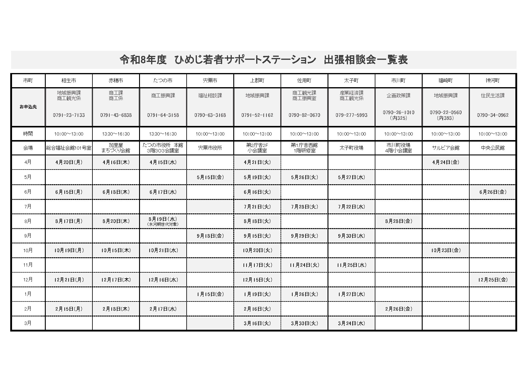 西播磨の各市町に、サポステの相談員がお伺いします。 あなたの就職に関するお悩みをお聞きし、1人1人に合った就職活動の仕方を一緒に考えます。 相談料:無料 対象:15~49歳の働いていない方、その家族